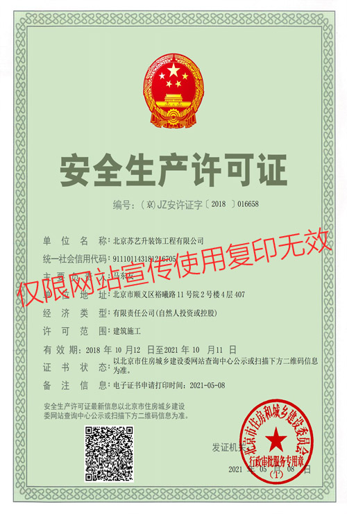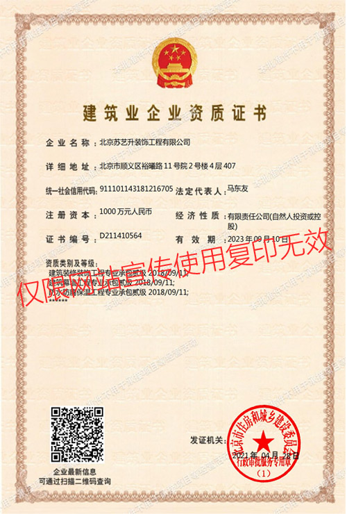 北京蘇藝升裝飾工程有限公司(以下簡稱”蘇藝升裝飾”)成立于2014年,公司前身根植于國內知名雙甲資質企業,通過裝飾行業20余年的磨礪,我們有著豐富的管理和施工經驗,以及一流裝飾公司的技術服務體系,通過不斷的努力和發展現已成為一家頗具實力的獨立法人企業,并成功獲取中華人民共和國住房和城鄉建設部頒發的:建筑裝修裝飾工程專業承包貳級、建筑工程施工總承包叁級、鋼結構工程專業承包叁級、建筑幕墻工程專業承包貳級以及防水防腐保溫工程專業承包貳級資質。 蘇藝升裝飾公司經過多年的磨礪及不...了解更多>